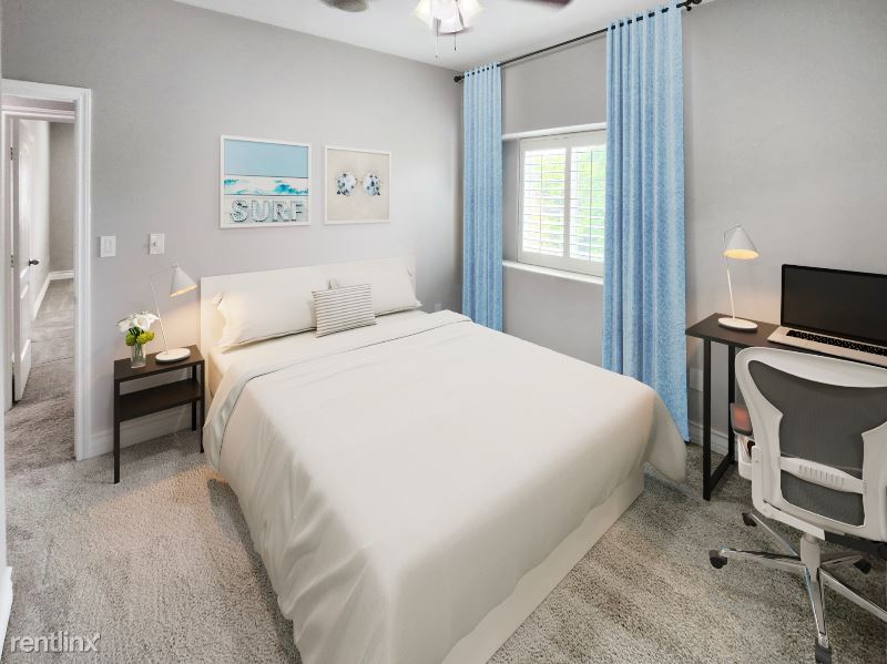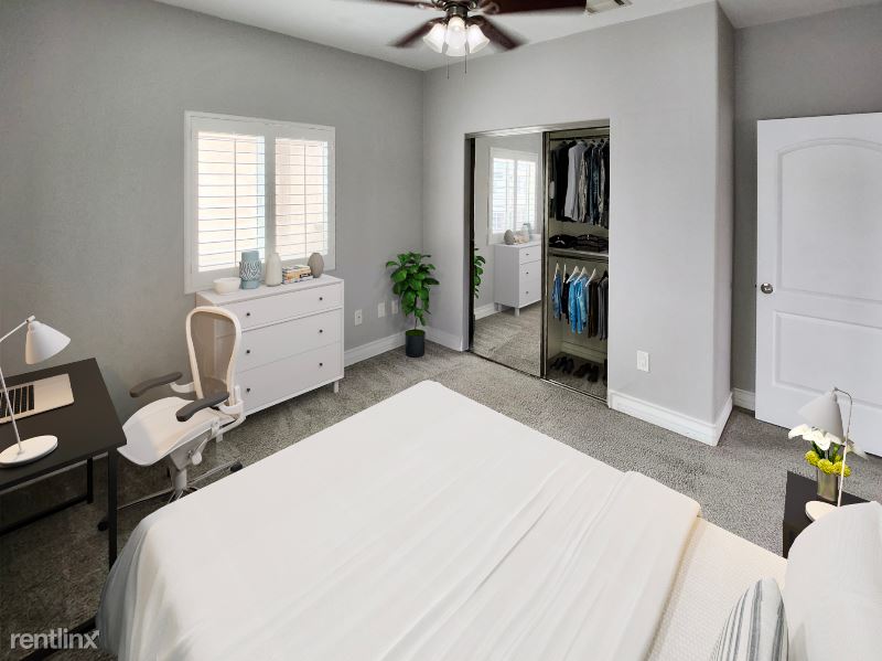 - Queen bed, desk, chair, dresser, closet, ceiling fan & digital keyless lock