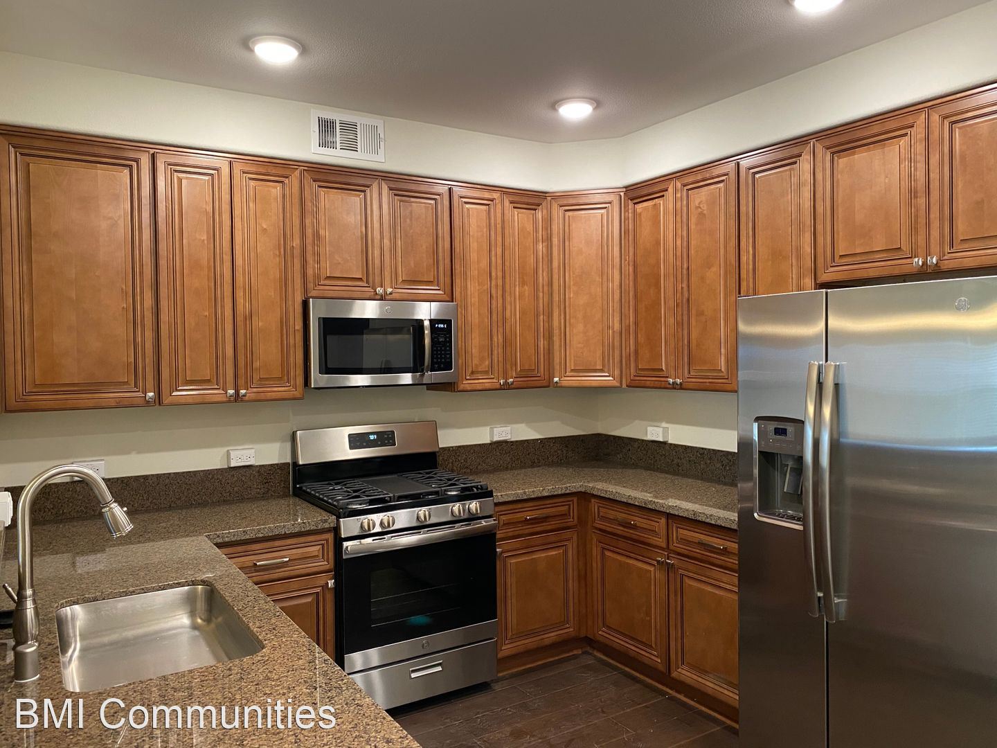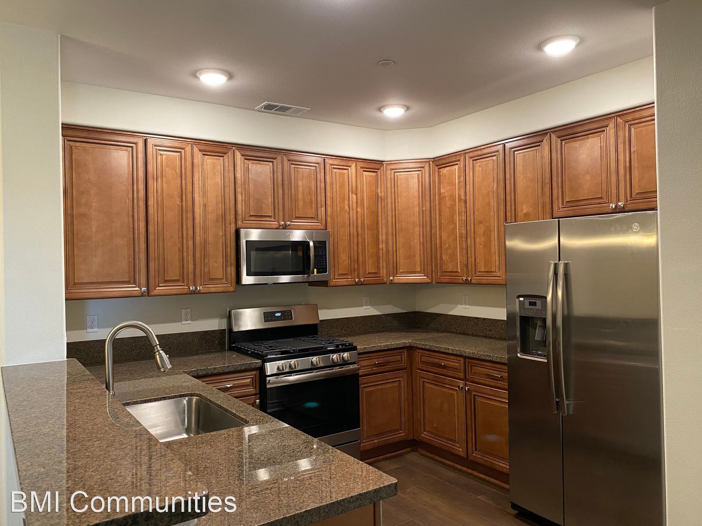 All of our apartments come with granite counter tops, custom cabinets with soft closing doors and drawers and pull out faucets in the kitchens. The units come with 9 ft ceilings and LED lighting throughout, ceiling fans in the bedrooms and chandeliers in the dining rooms with dimmers. The apartments come with central heating and air, solid surface flooring throughout and carpet in the bedrooms. All of the appliances are included including a stove, microwave, dishwasher, refrigerator AND a FULL SIZE washer and dryer. All of the units also come with an attached or detached garage. We also have a Pool & Spa with outdoor shower, a Gym, Business Center and Wifi in common areas.