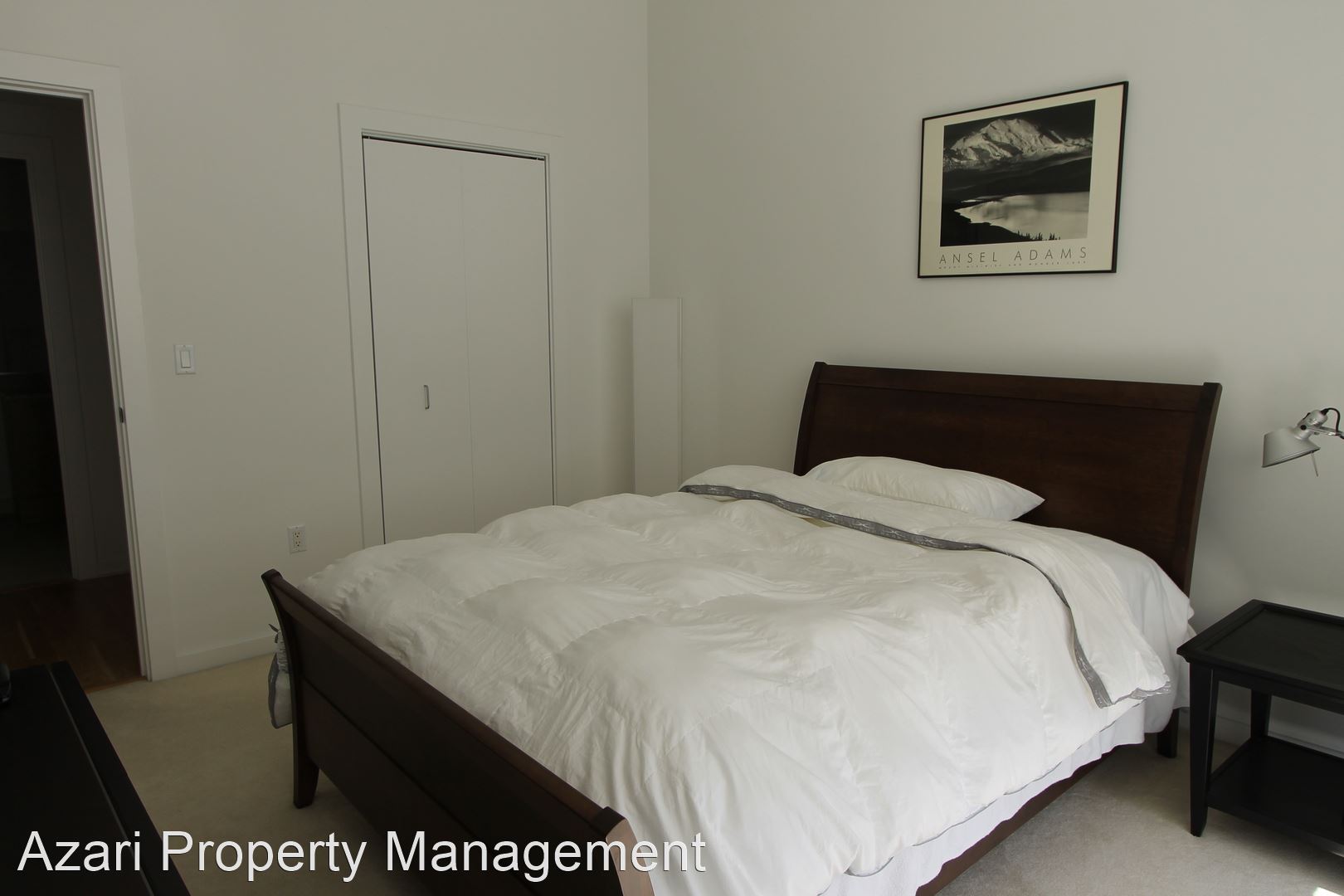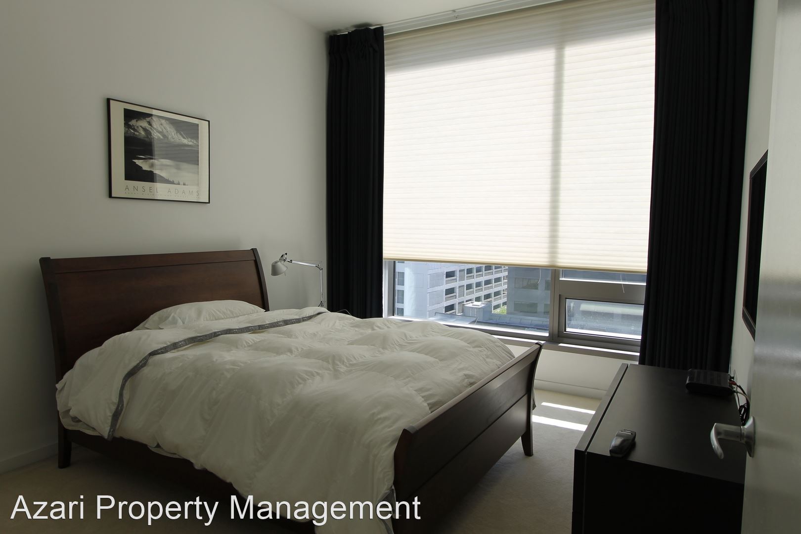 Bedroom has honeycomb blackout roll up shades & nice drapes. High ceilings in the bedroom, allows for tall closet