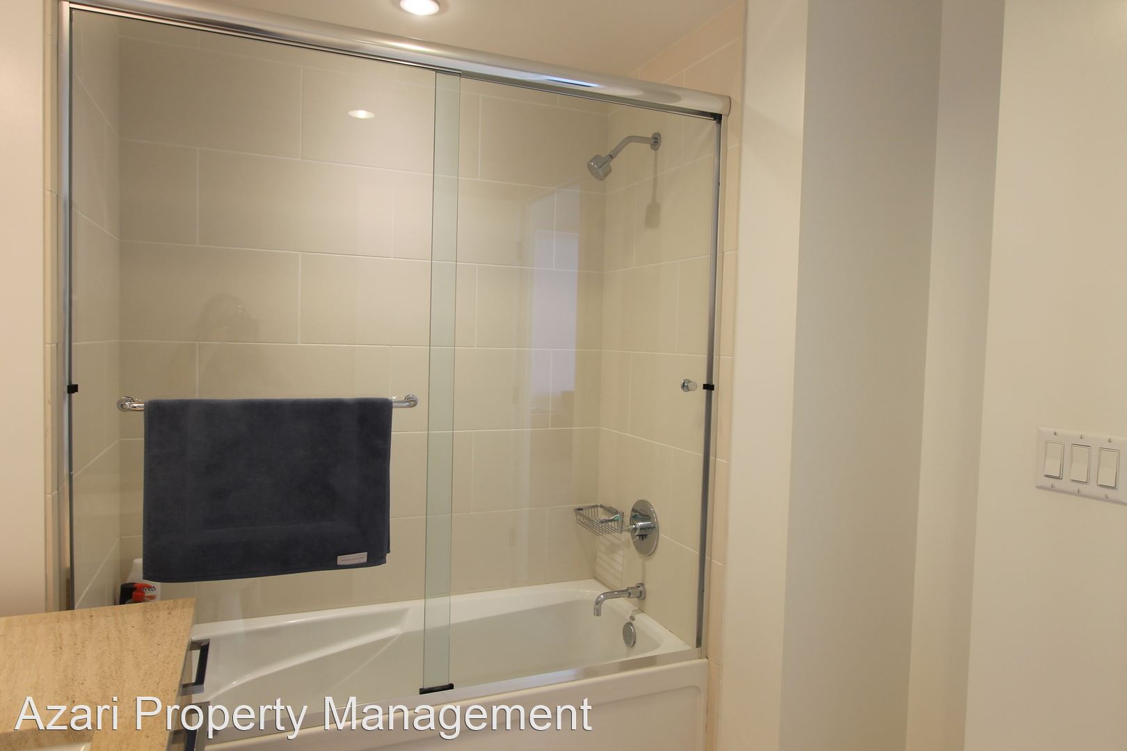 Bathroom has a combination bath tub/shower. The owner has done two upgrades - ceiling light in the bath tub/shower and custom shower doors.