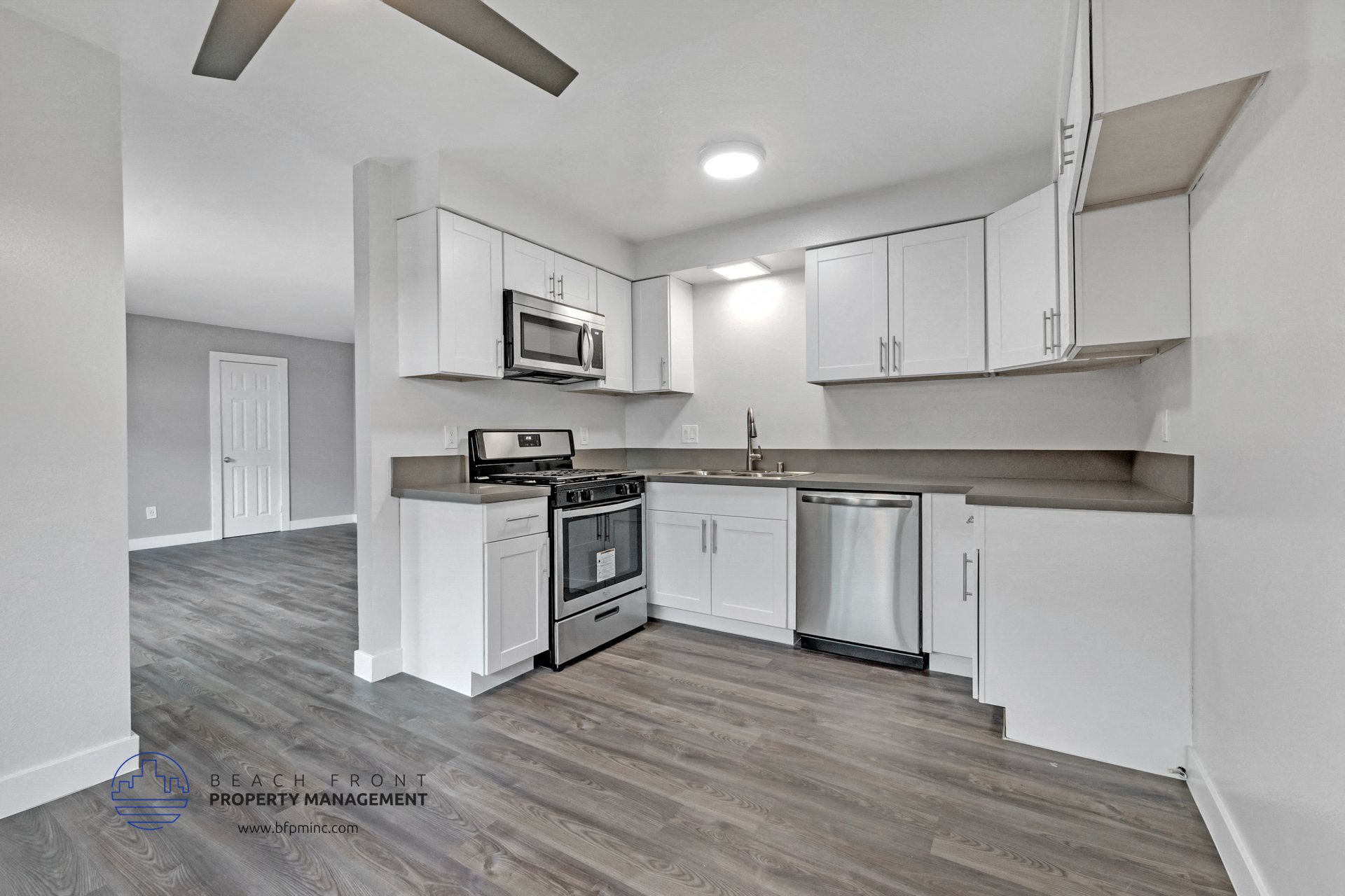 The Gardens on Arlington offers spacious, beautifully renovated 2 and 3 bedroom units perfect for today's working millennials. These units feature sleek, modern design elements that appeal to Southern California residents. Kitchens are equipped with stainless steel appliances, including a gas range, dishwasher, and microwave, accented by white cabinetry and contemporary countertops. The open-concept layout seamlessly connects the kitchen to the living and dining areas, creating a bright, airy space. Wood-style flooring flows throughout the units, enhancing their modern appeal, while ceiling fans provide comfort and efficiency. Generous closets with sliding doors offer ample storage, and large windows fill the rooms with natural light. Select units feature private balconies or patios for outdoor enjoyment, making these homes both comfortable and stylish.