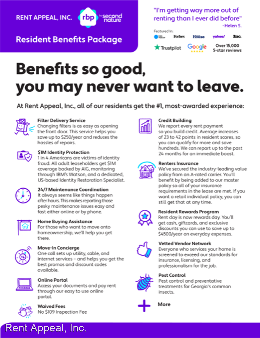 All Rent Appeal, Inc.residents are enrolled in the Resident Benefits Package (RBP) for $51.95/month which includes HVAC air filter delivery (for applicable properties), pest control, waived $109 annual walk through fee, credit building to help boost your credit score with timely rent payments, $1M Identity Protection, utility concierge service making utility connection a breeze during your move-in, our best-in-class resident rewards program, and much more! More details upon application.
