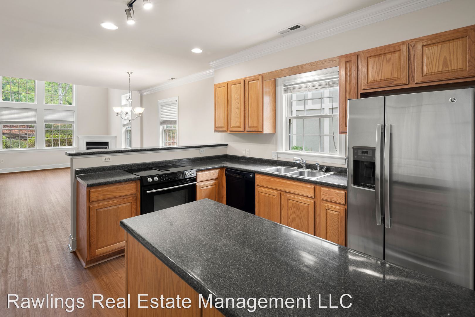 The living room features a gas fireplace, soaring ceilings, and great natural light from large windows overlooking beautifully landscaped grounds. The open kitchen has solid surface counters and nice appliances including the refrigerator, dishwasher, and ceramic stove top range with built-in ventilation system.